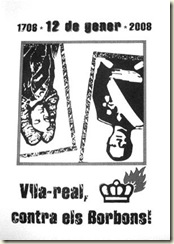 Per al pròxim dissabte 12 de gener, aniversari de l’incendi de Vila-real durant la Guerra de Successió, la Comissió Comarcal dels “300 anys d’ocupació, 300 anys de resistència” –campanya unitària de l’Esquerra Independentista, impulsada per l’AJPB, la COS, Endavant, Maulets i el SEPC– hem convocat, amb la col·laboració de les penyes futbolístiques Borratxots i Estel Groc, una cercavila reivindicativa que, partint a les 12 H. de la placa commemorativa “en record dels herois del nostre poble morts en de-fensa dels Furs i les llibertats valencianes” (situada al final del C / Major Sant Jaume, can-tonada amb Pere III), recorrerà els carrers del centre fins arribar a la Torre Motxa, l’única part de la ciutat medieval que va sobreviure a la cremà, on retrem homenatge als nostres heroics avantpassats, els defensors de la vila.
